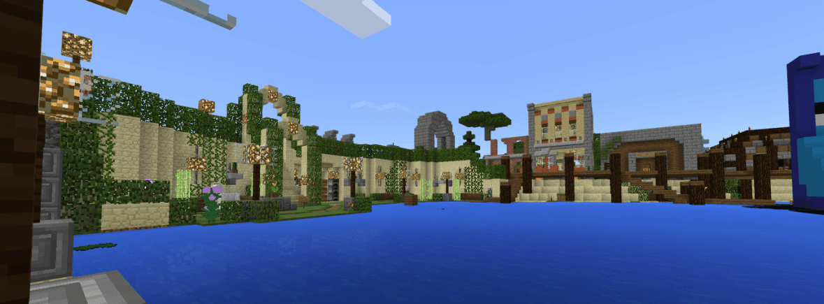 View of Spawn including safe house(s), stable, nether access, and fishing pier/harbor